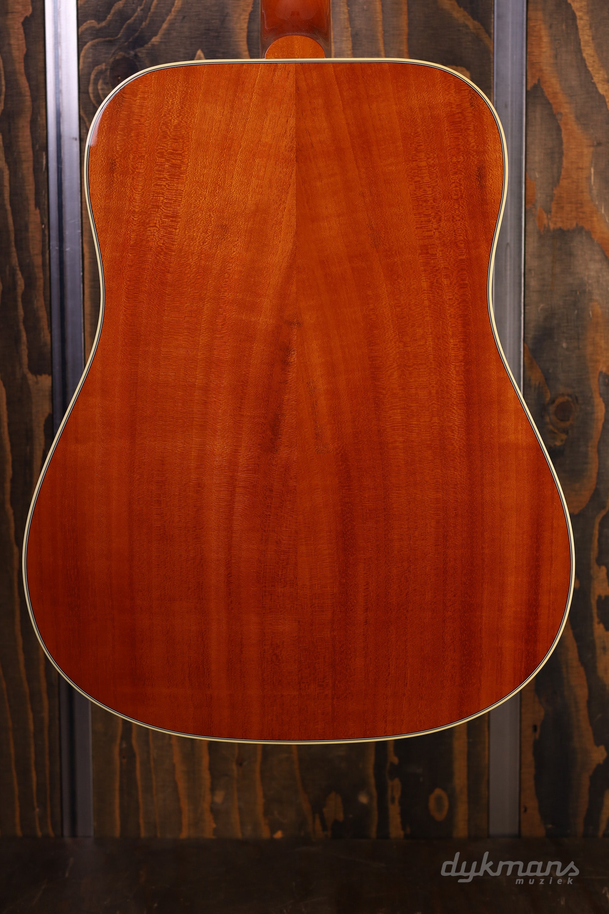 De karakteristieke square-shoulder jumbo body is opgebouwd uit mahonie zij- en achterkant met een Sitka sparren bovenblad. Deze houtcombinatie zorgt voor een warme, volle basis met een duidelijke midrange, terwijl de hoge tonen helder en expressief blijven. Dankzij de handmatig geschulpte X-bracing reageert de gitaar uiterst dynamisch en behoudt hij zijn open, ademende klank—perfect voor zowel subtiel fingerstyle spel als stevige strumming.