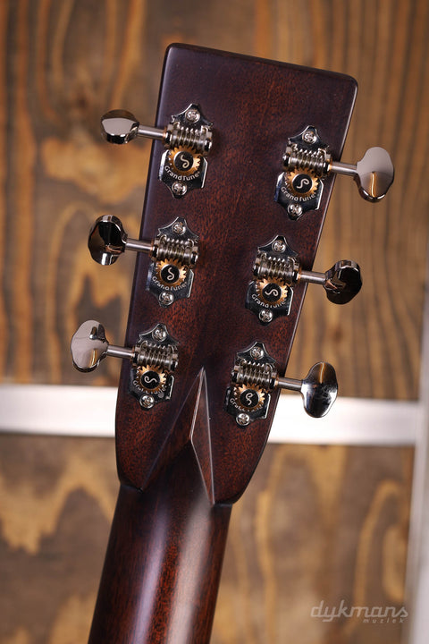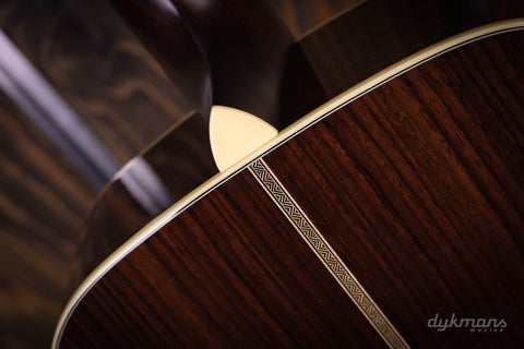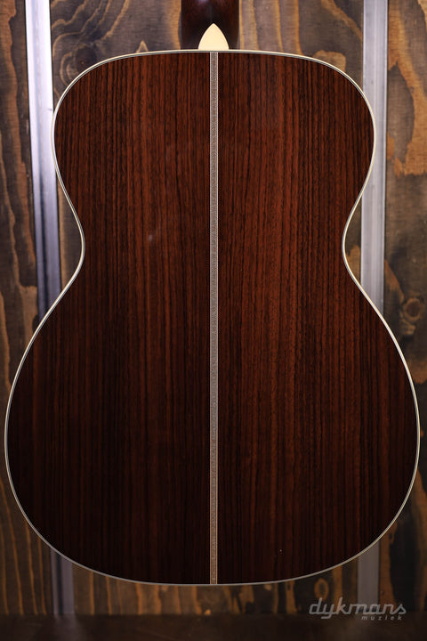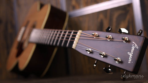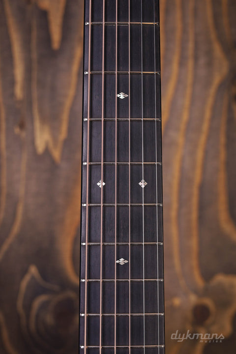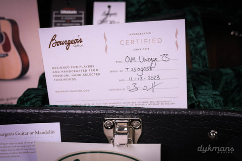 The Bourgeois Touchstone series is a collaboration between Bourgeois and Eastman. The top quality tops and bracings are made by Bourgeois and, after a personal check by Dana Bourgeois herself, packaged airtight and sent to Eastman. There they are further completed into very complete and impressive guitars. The OM-Vintage/TS discussed here is an Orchestra model with a rosewood back and sides, ebony fingerboard and an Alaskan Spruce top. The Bracings are made from Adirondack for amazing projection. Furthermore, this Bourgeois Touchstone is equipped with Schaller Grand Tune Nickel tuners, a nice sturdy V-neck profile and a beautiful hardshell case.