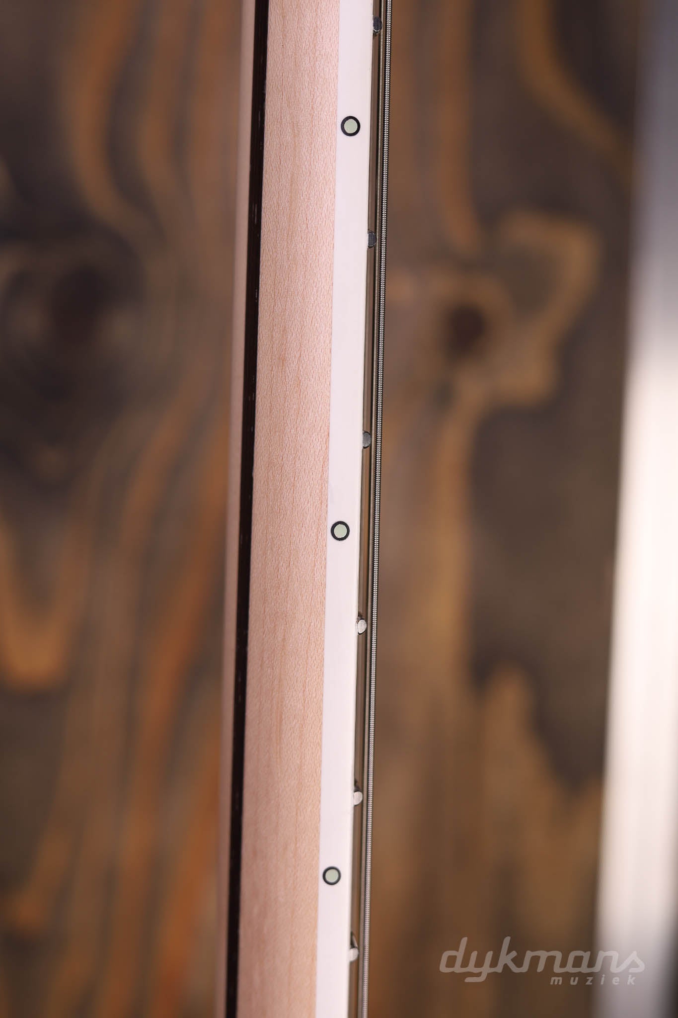 Fretboard: Bound Macassar Ebony fretboard w/ Off-set Mother of Pearl dot inlay
