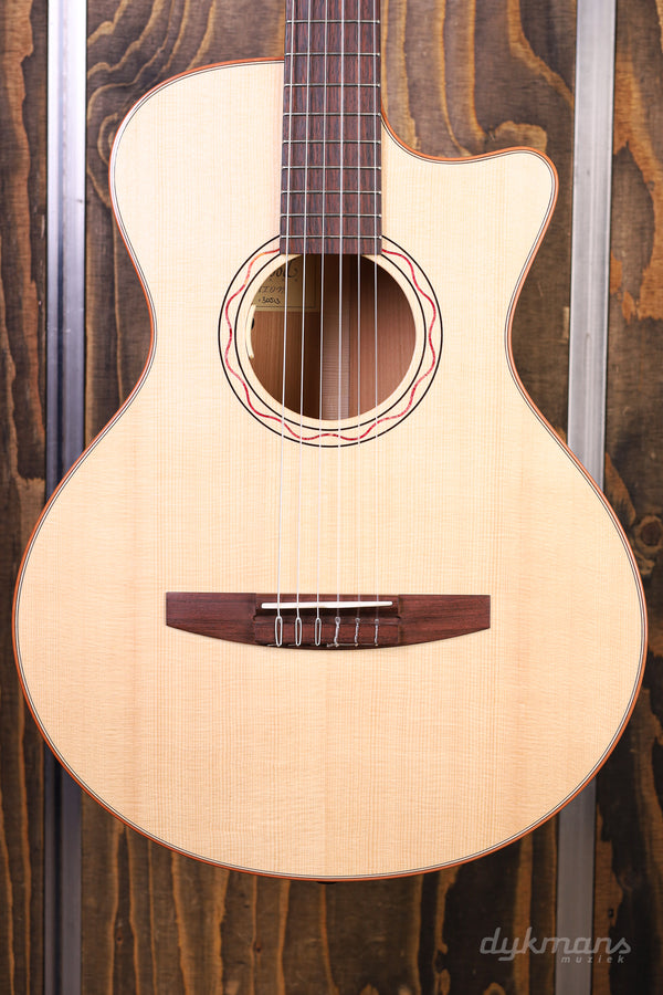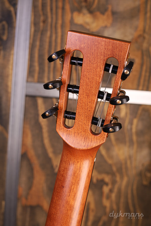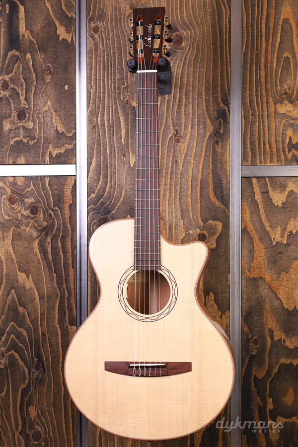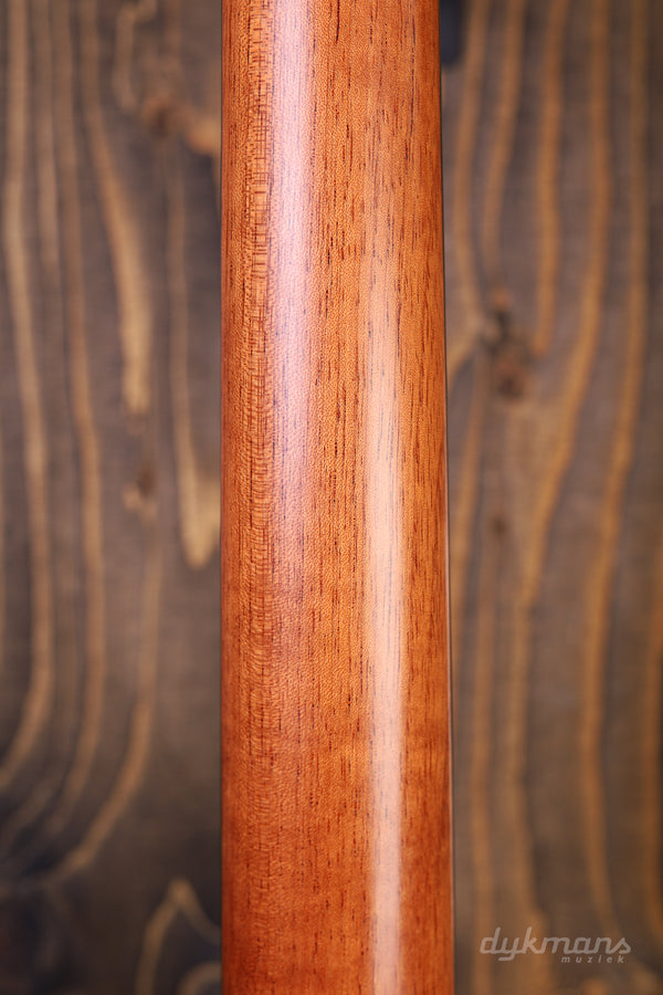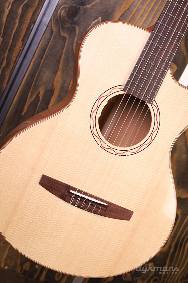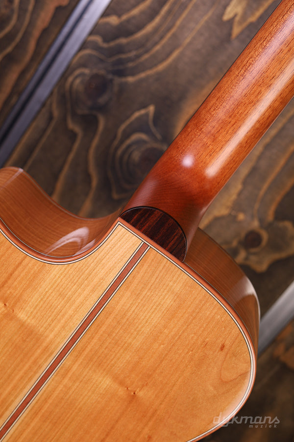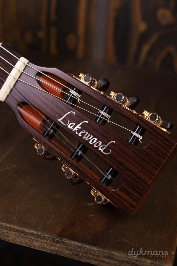 Lakewood blijft ons iedere keer weer verrassen. Het sympathieke merk van de even zo sympathieke luthier Martin Seeliger brengt ieder jaar zogenaamde 'Edition' modellen uit. De insteek is dat de Custom Shop van het Duitse merk ieder jaar een gelimiteerd aantal modellen uitbrengt met een aantal bijzondere features, combinaties van productiemethodes of unieke esthetische kenmerken. Zo ook bij deze Lakewood A-38 Edition 2020. Waar het merk vooral bekend staat om de fraaie staal-snarige gitaren dat het merk maakt, is er ditmaal gekozen voor een klassieke nylon configuratie. De combinatie van het AAA Europees sparren bovenblad en de kersenhouten zij- en achterkant is op z'n zachtst gezegd natuurlijk al spannend te noemen. Zeker in combinatie met de 25.6" mensuur levert dit een sprankelende en strakke toon op die een smaakvolle balans biedt tussen een warm karakter in het laag, en een bijna sprookjesachtige presence in de boventonen. Details zoals het met hout ingelegde rosette rondom het klankgat, de palissander toets en de prachtige Der Jung Classic gouden stemmechanieken maken het geheel op smaakvolle wijze af. Tot slot vinden we het alom geprezen LR Baggs Anthem SL Classical element terug zodat je direct podiumklaar bent. Inclusief Hiscox koffer.